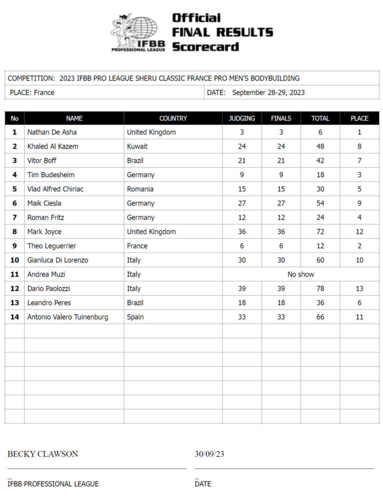 The post 2023 Sheru Classic France Pro Scorecards first appeared on IFBB PRO.